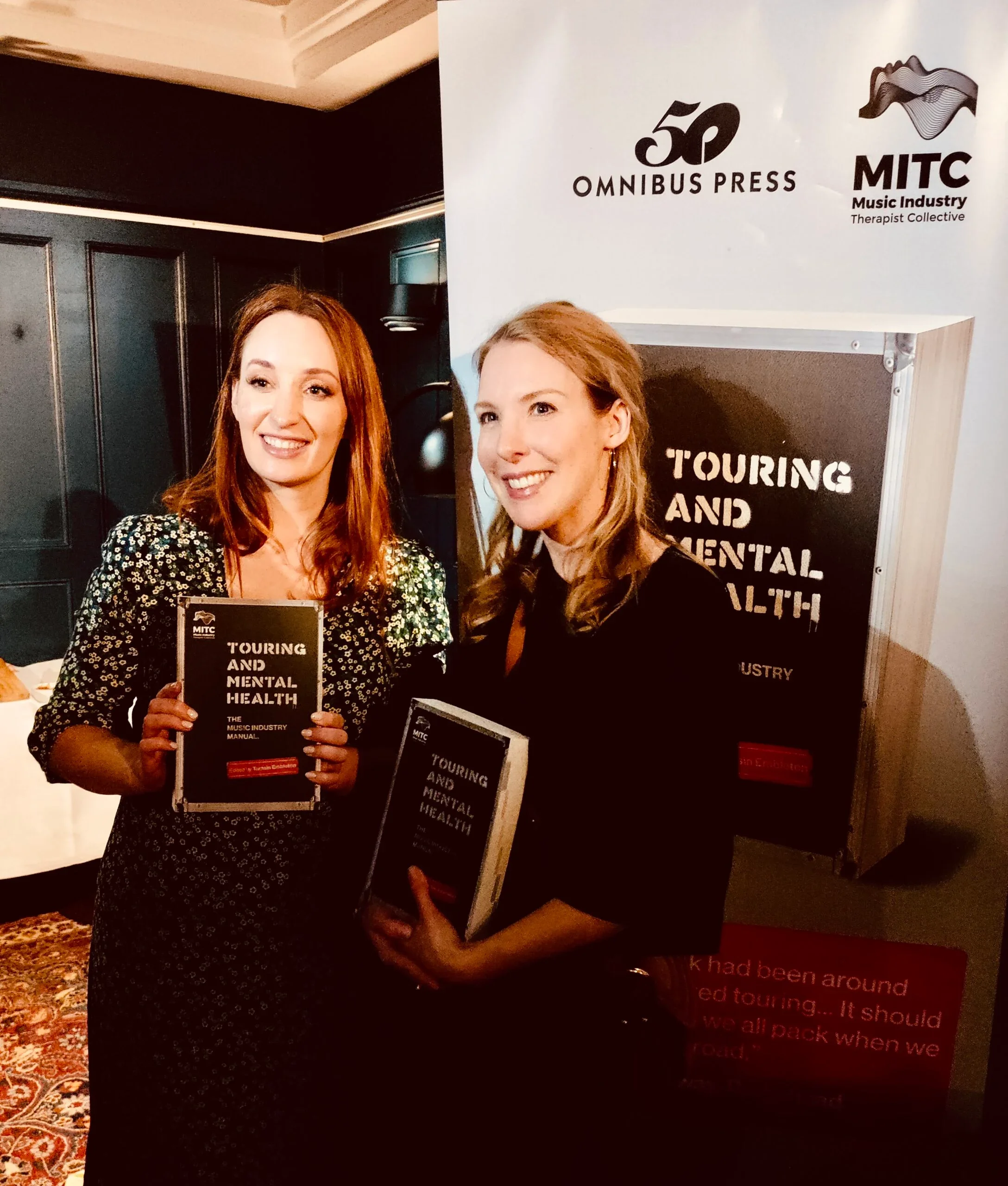 Tamsin Embleton (left) and Laura Newton holding the ‘Touring and Mental Health: the Music Industry Manual’. Courtesy The Music Industry Therapist Collective.